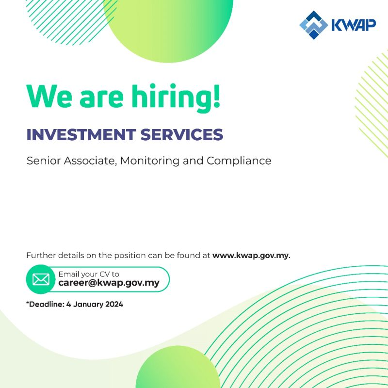 KWAP Malaysia: 1. Assistant Vice President, Finance and Accounts 2. Associate, Branding and Communication 3. Senior Associate, Monitoring and Compliance 4. Associate, Software Engineer